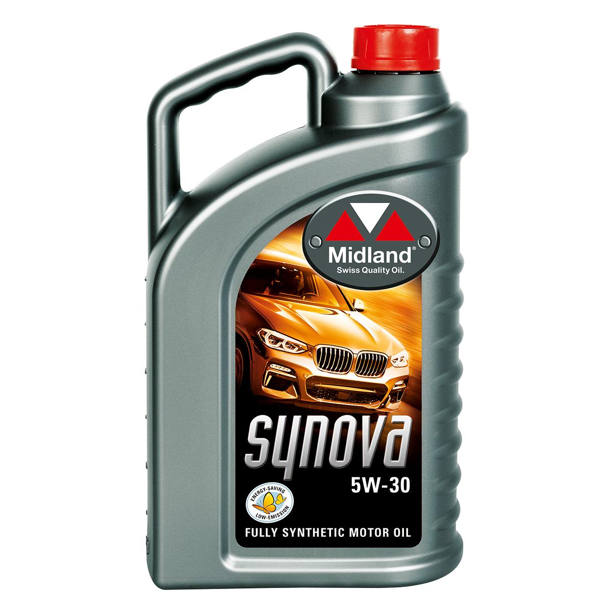 Midland SYNOVA 5W-30 – 100% синтетична енергозберігаюча Long Life моторна олива, яка призначена для застосування у всіх сучасних бензинових та дизельних двигунах легкових автомобілів.  Особливо рекомендовано для автомобілів BMW та Mercedes-Benz.